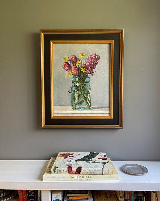 Tulips, Jonquils, and Hyacinth in Canning Jar, framed oil painting, 20 x 16 inches