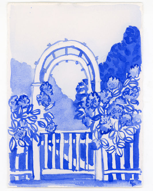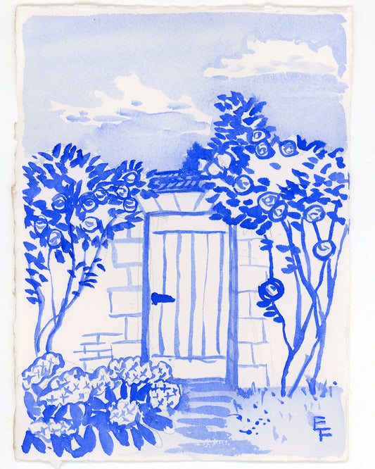 The Secret Garden Gate, Blue and White Watercolor, Unframed