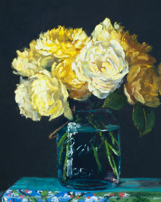 Yellow Roses on Stack of Books, framed oil painting, 20 x 16 inches