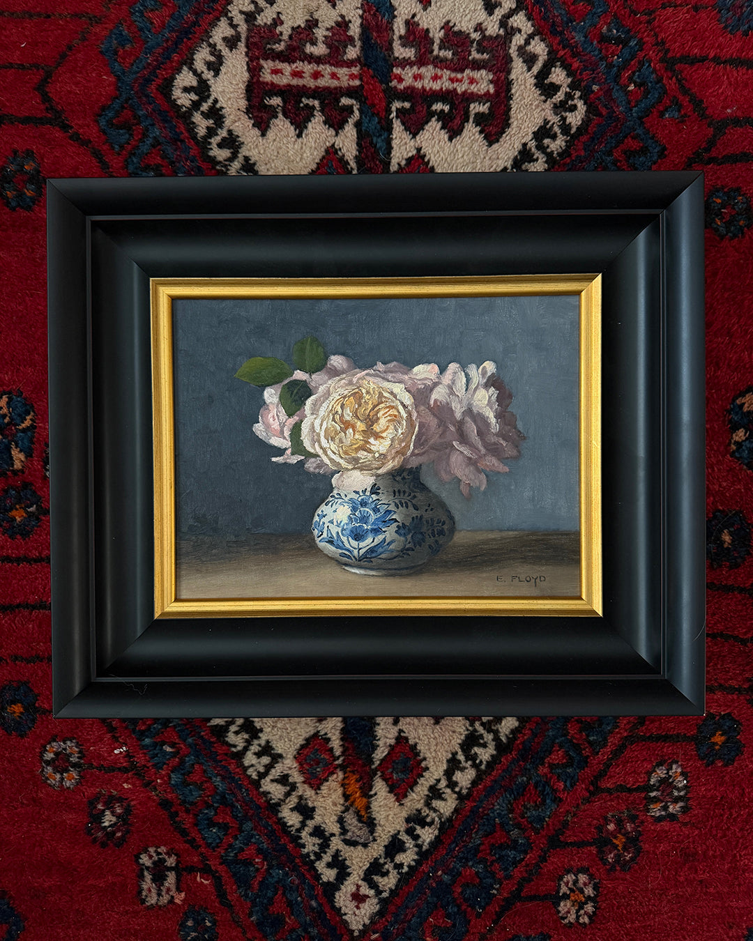 Roses in Delft Vase, 9x12 inches, Framed Oil Painting